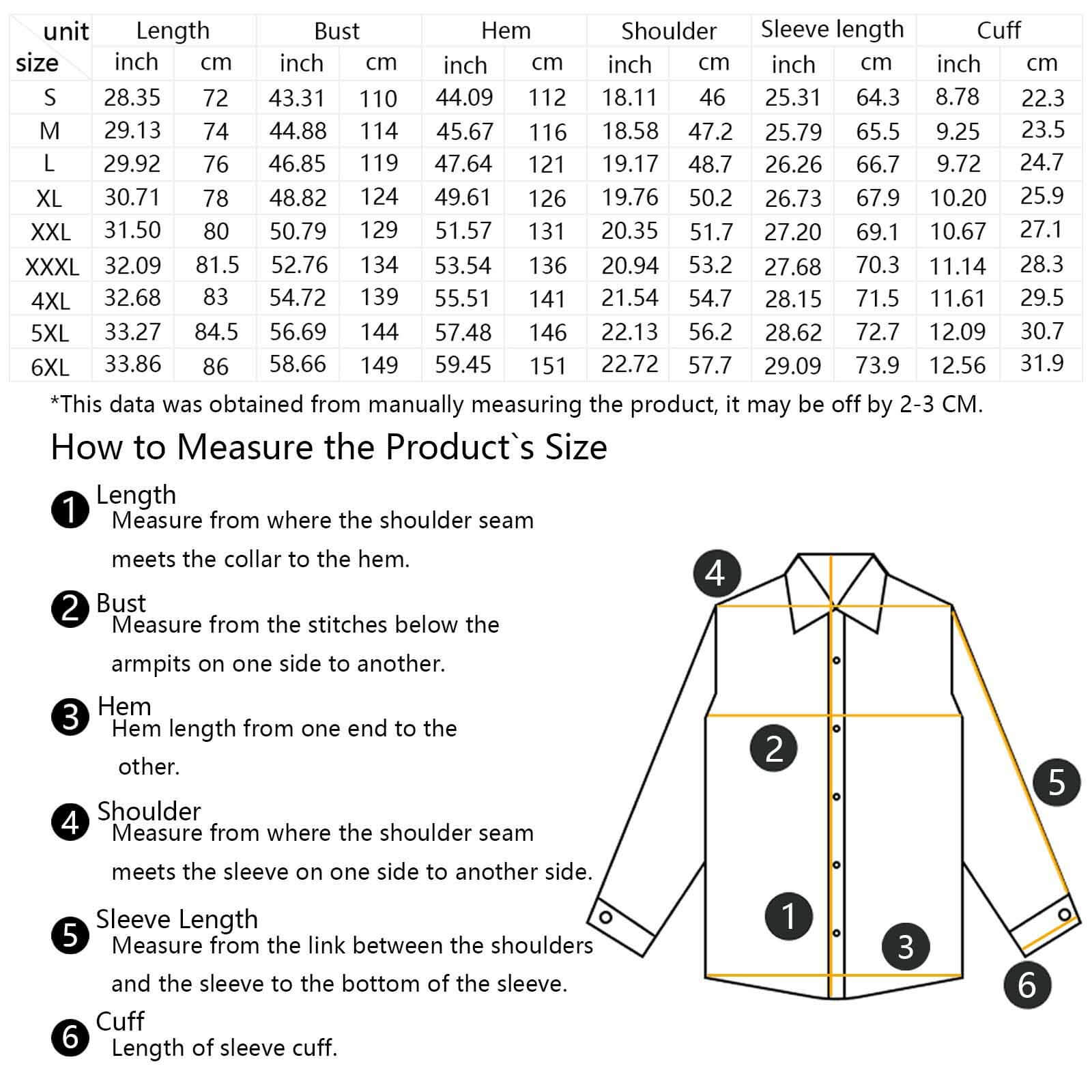 6XL | 86/33.86 | 149/58.66 | 151/59.45 | 57.7/22.72 | 73.9/29.09 | 31.9/12.09 |