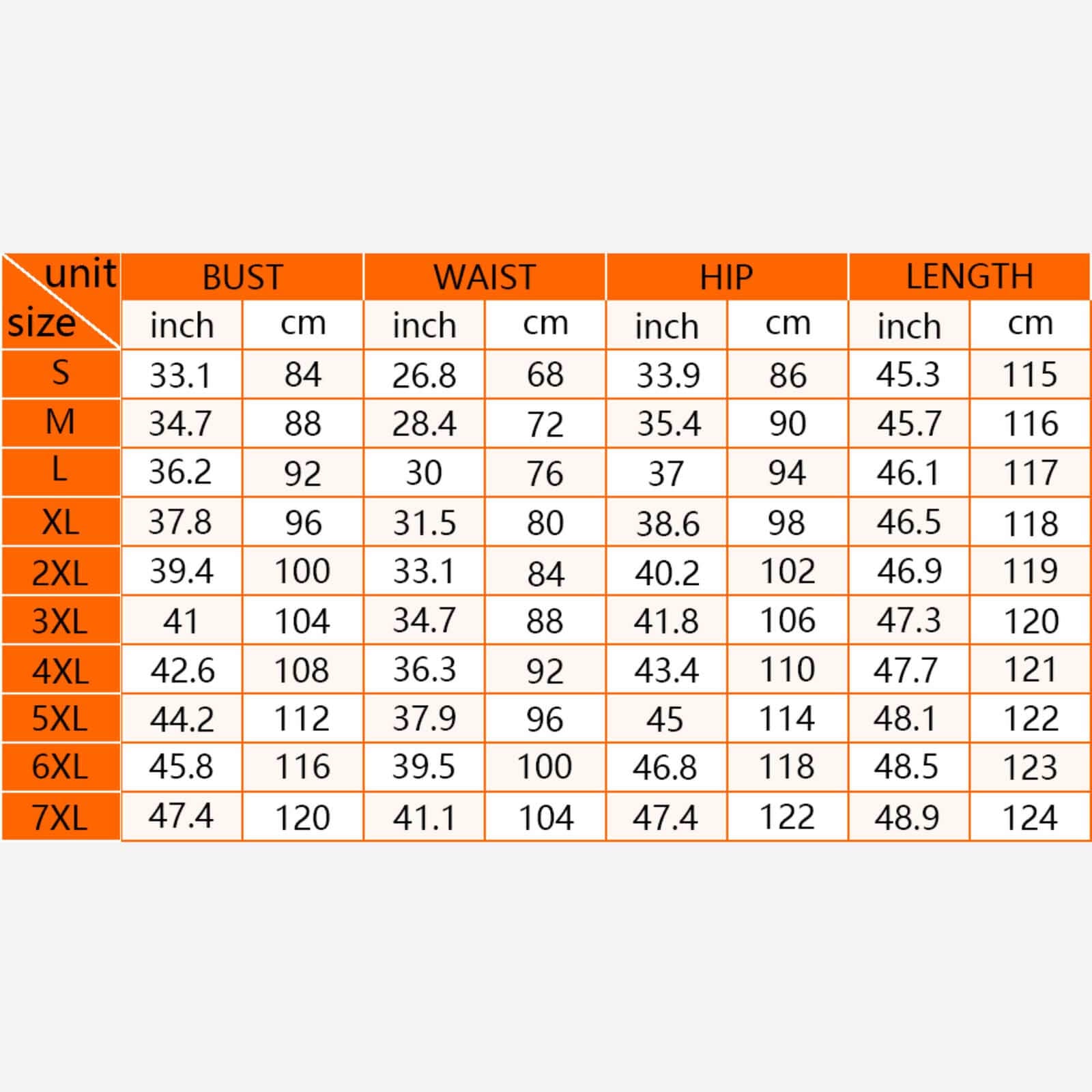 サイズ | 胸囲 (cm/in) | 腰囲 (cm/in) | ヒップ (cm/in) | 着丈 (cm/in) |