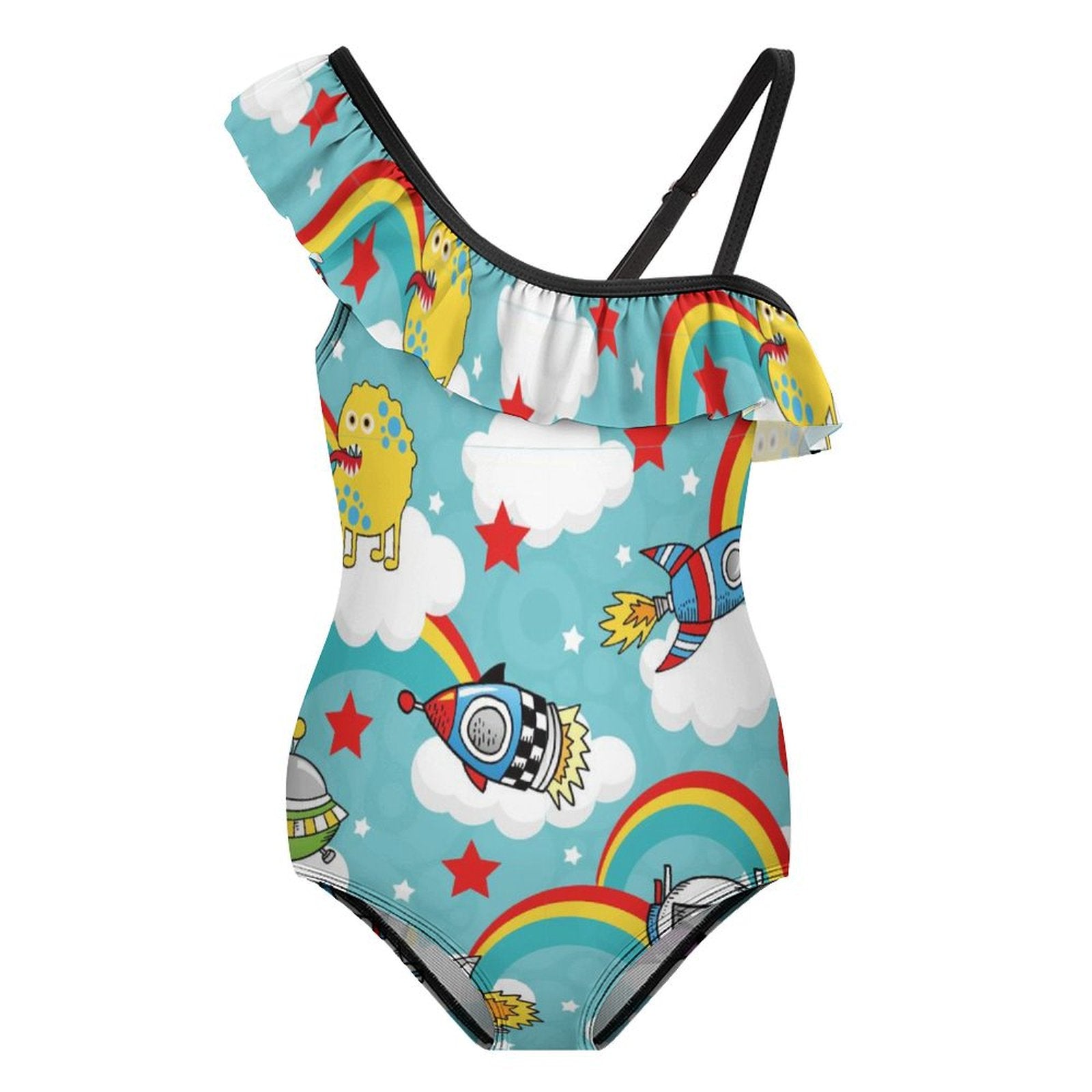 幅広の肩紐と、愛らしいフリルデザインが特徴。動きやすさと可愛らしさを両立し、どんなに元気に遊んでも、ずれにくい安心感があります。