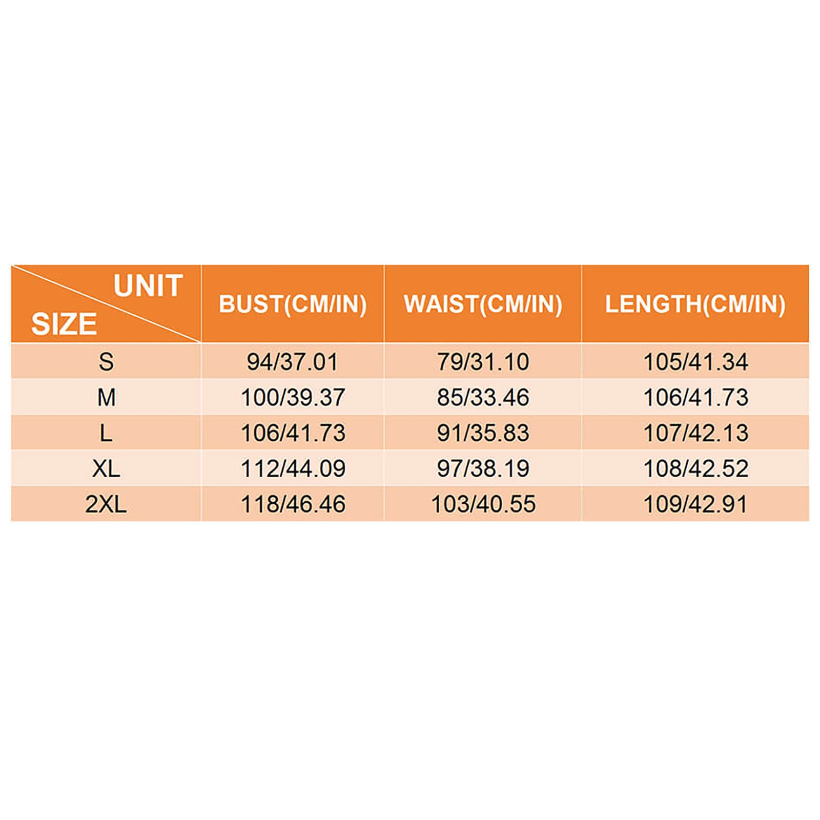 サイズ | バスト (cm/in) | ウエスト (cm/in) | 着丈 (cm/in) |