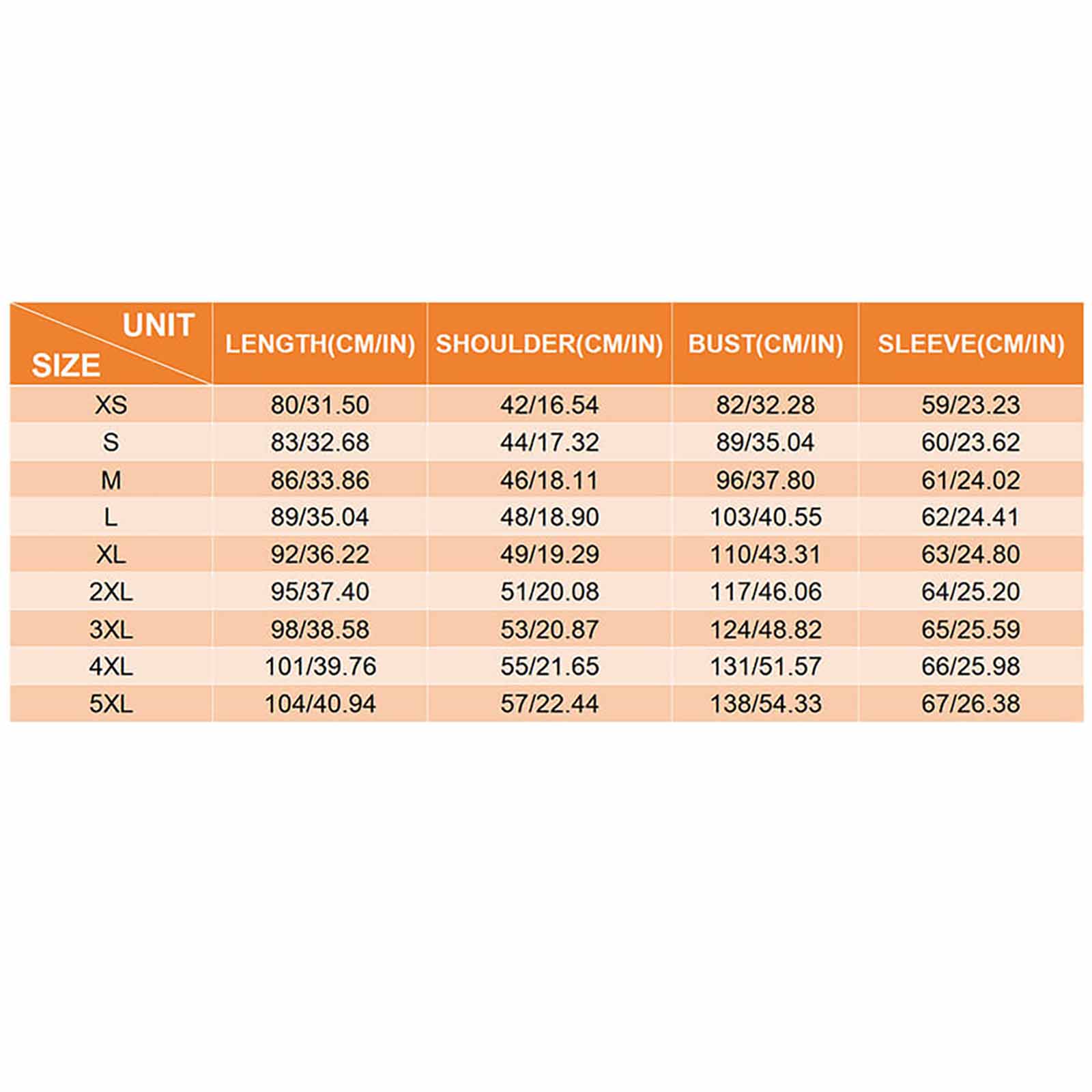 サイズ 着丈 (cm/in) 肩幅 (cm/in) 胸囲 (cm/in) 袖丈 (cm/in)