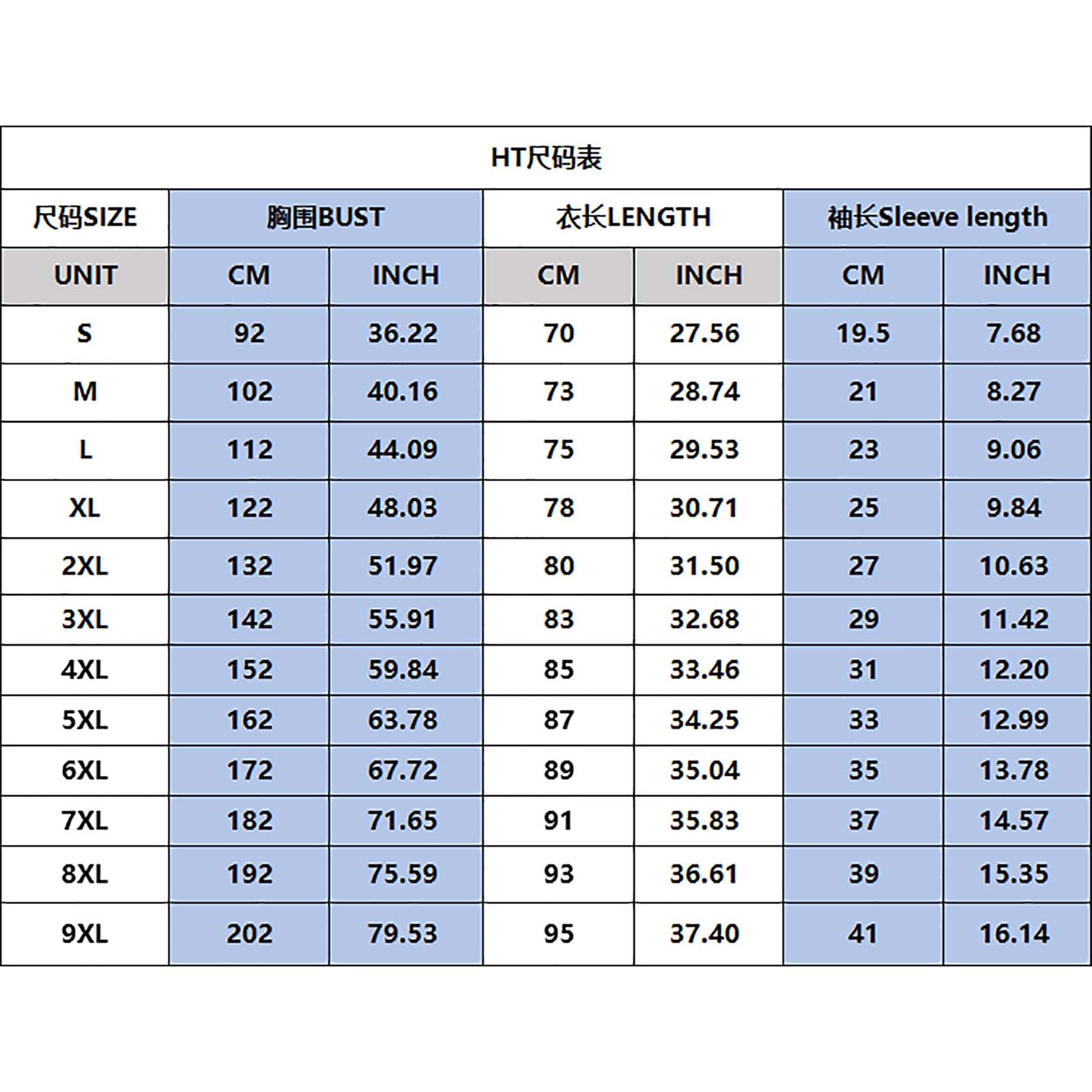 サイズ | 着丈 (cm/in) | 胸囲 (cm/in) | 袖丈 (cm/in) |