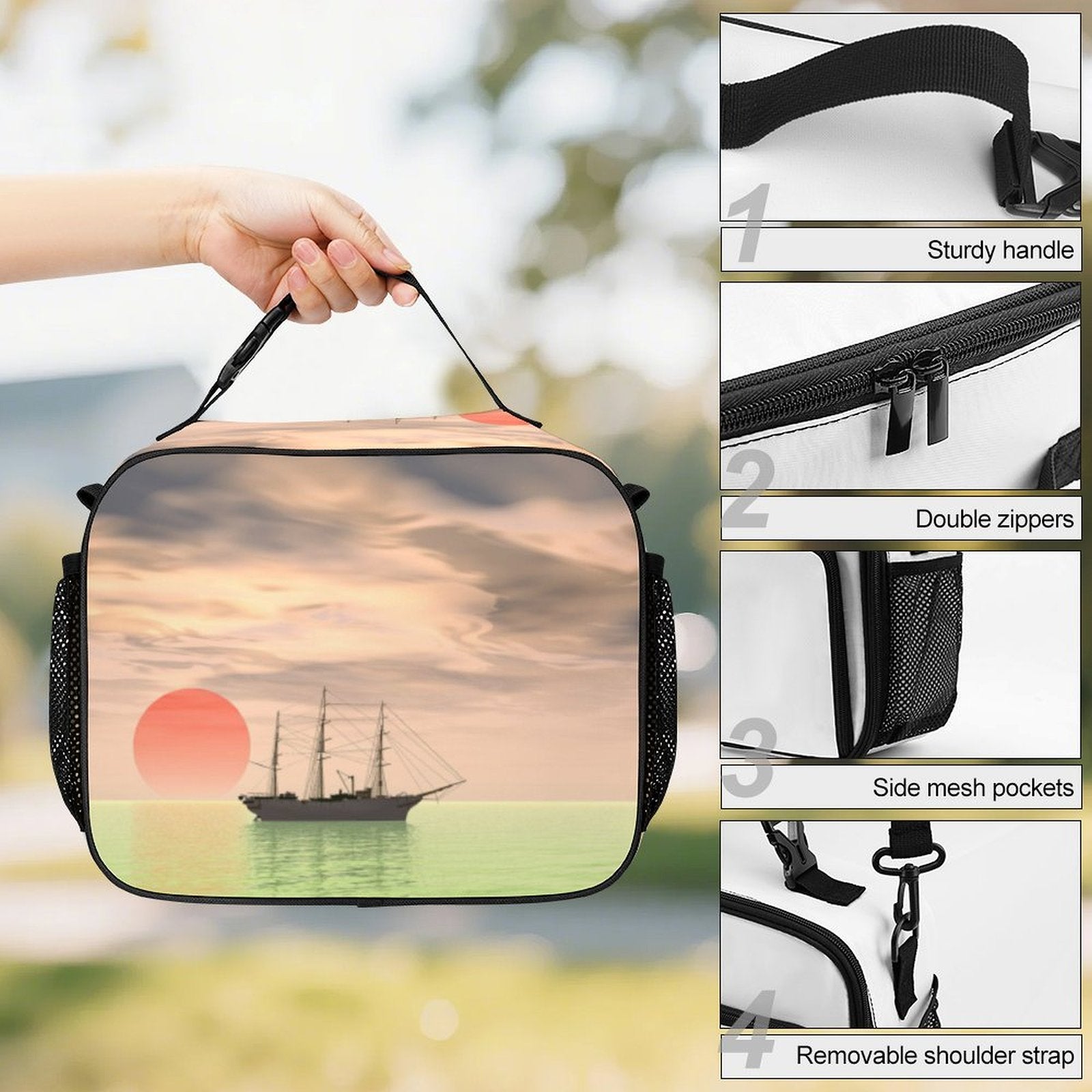 広々としたメインコンパートメントは、ランチボックス、おやつ、果物だけでなく、ピクニックの道具、買い物のエコバッグ、さらにはちょっとしたお出かけのサブバッグとしても。両サイドのポケットは、飲み物や傘の指定席です。そして、取り外し可能なショルダーストラップは、あなたの両手を解放します。