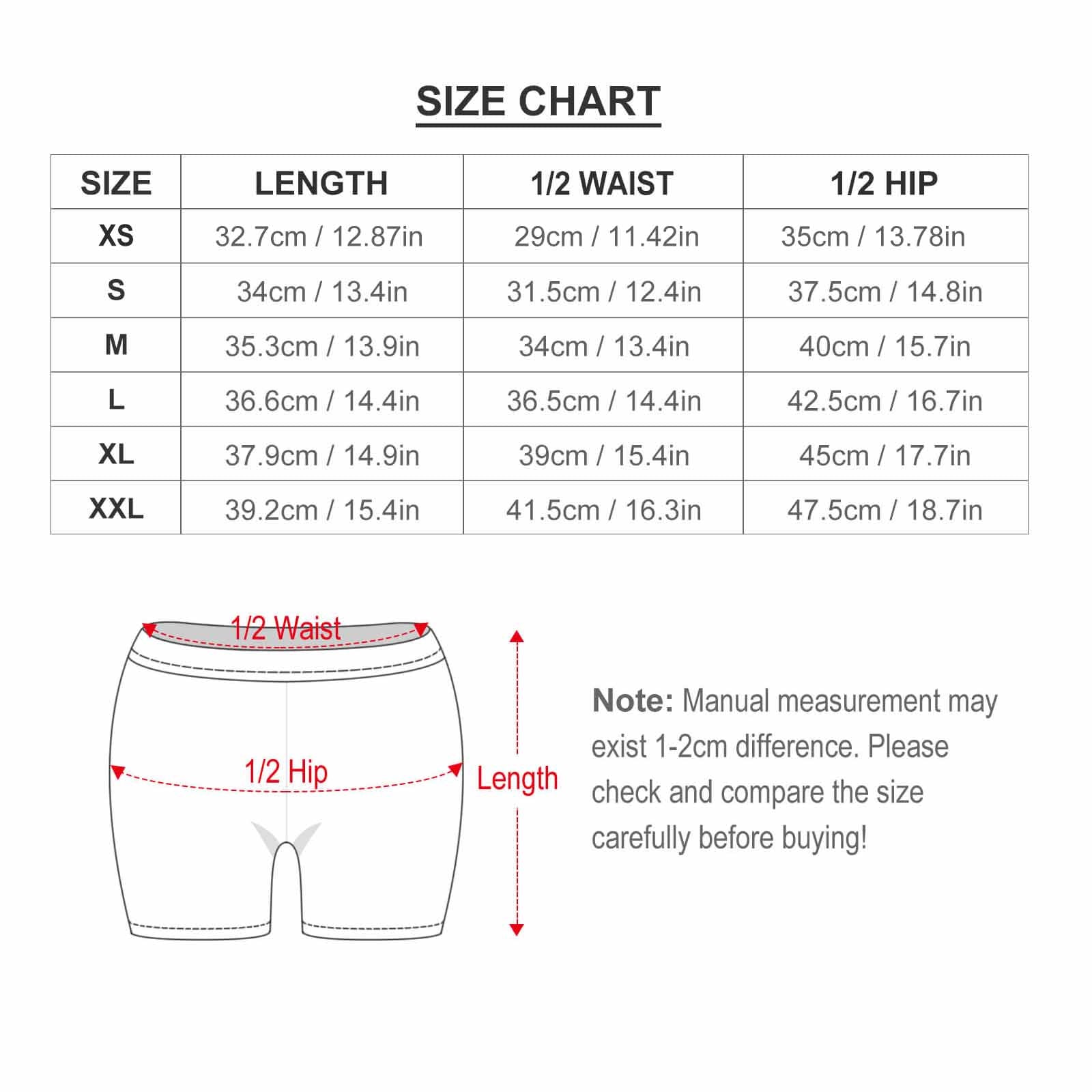 | サイズ | パンツ丈 (cm) | 1/2 ウエスト (cm) | 1/2 ヒップ (cm) |